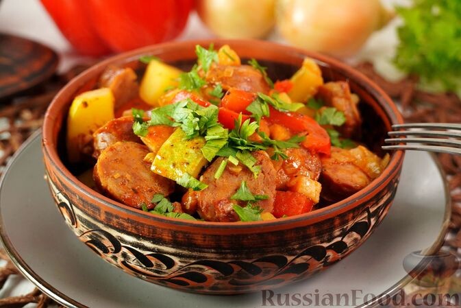 - Овощное рагу с колбасой: это сытное и ароматное блюдо станет настоящим открытием для любителей деревенской кухни. Все ингредиенты готовятся в одной кастрюле: от жареного лука и бекона до свежих овощей и домашней колбасы, все пропитывается томатным пюре и бульоном.