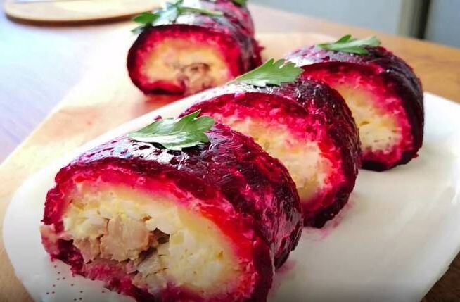 Удивите своих гостей новым прочтением классического салата селедка под шубой — приготовьте его в виде рулета! Этот оригинальный подход не только привнесет новизну на стол, но и создаст эффектную подачу, с каждым ломтиком открывая разнообразие цветов и текстур.