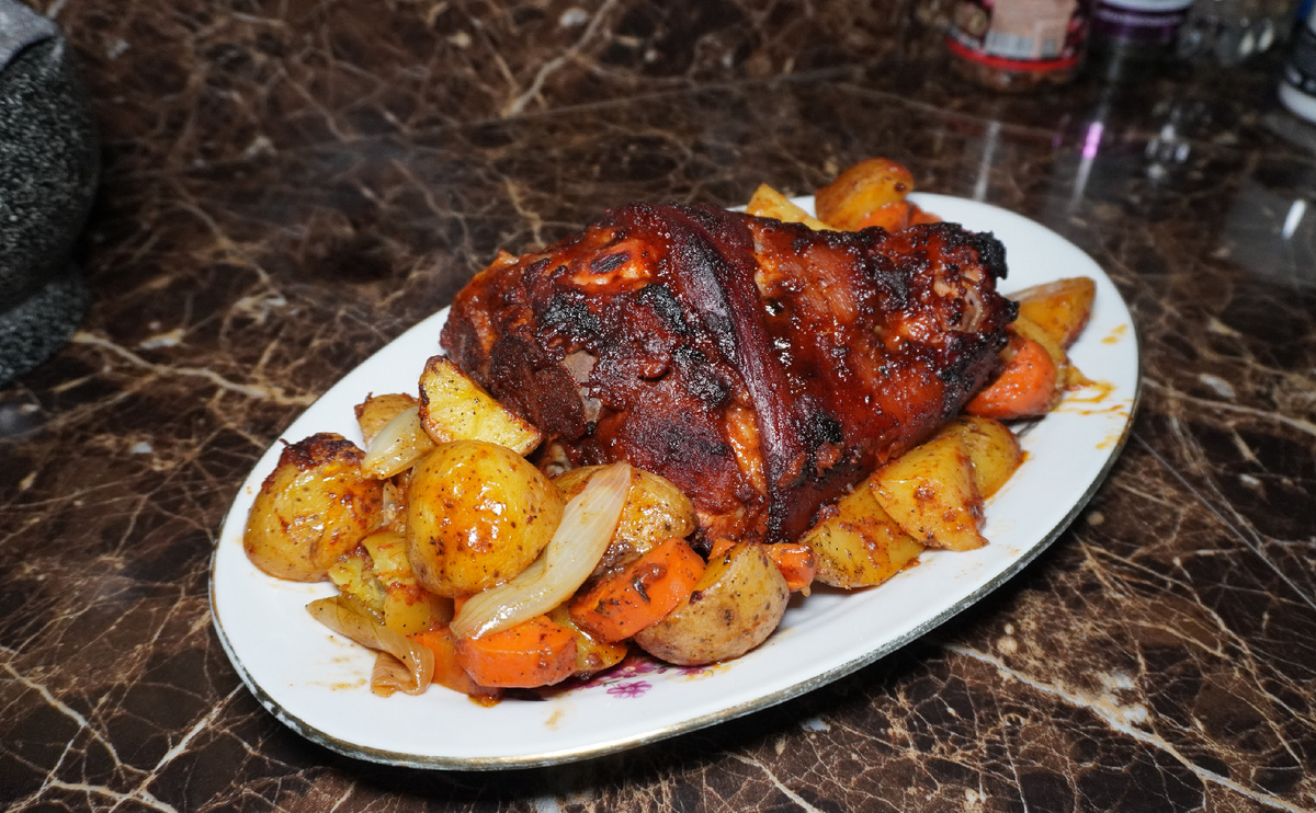 Сначала следует сделать надрезы на коже рульки, придавая ей ромбовидный вид, и проколоть несколько отверстий ножом для лучшего пропитывания.Приготовьте обмазку, смешав томатную пасту, соль, сушеный чеснок, черный перец, копченую паприку, мед и соевый соус. Обмажьте рульку полученной смесью.Нарежьте морковь полукольцами, а картофель и лук — крупными кусками. Посолите, поперчите и добавьте сушеный чеснок вместе с растительным маслом. Перемешайте и поместите в рукав для запекания. На верх положите рульку, запечатайте рукав и сделайте несколько отверстий зубочисткой.Поставьте в заранее разогретую до 160°С духовку на 2 часа. По истечении времени аккуратно откройте рукав, полейте рульку выделившимся соком и подрумяньте в духовке, разогретой до 220°С, еще 10-15 минут.И вот она — совершенно готовая рулька, которую приятно подать к столу. Приятного аппетита!