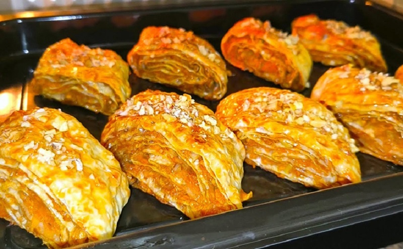 Орехи добавляют нотки насыщенности. Грецкие орехи богаты питательными веществами, а в сочетании с корицей и мёдом создают взрыв вкуса. Яйца и сметана делают начинку нежной и сочной, а итог — выпечка мягкой внутри и хрустящей снаружи.