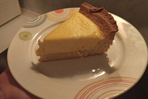 6. Вылейте начинку на тесто, следите за тем, чтобы уровень начинки был ниже бортиков хотя бы на 2 см.