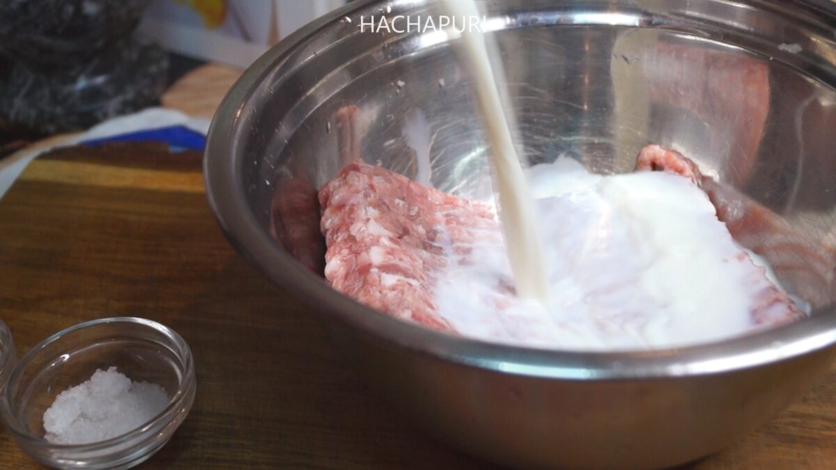 Процесс начинается с того, что в фарш (где-то 400 г, он может быть куриным или говяжьим) добавляется 150 мл молока. Важно тщательно перемешать массу до однородной консистенции и оставить её в холодильнике на пару часов.