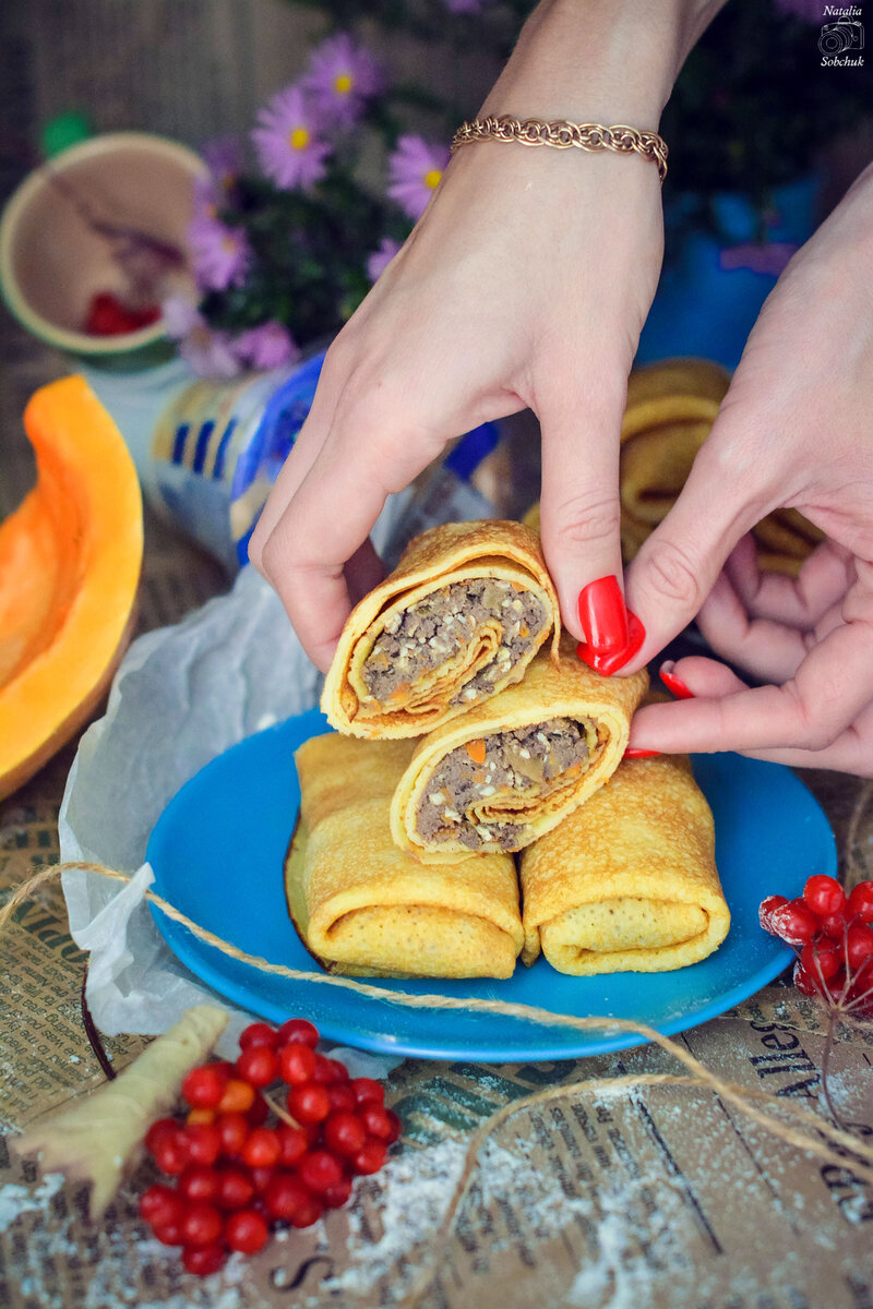 Тыквенные блинчики с печенью и яйцом — это отличный способ разнообразить праздничное меню во время Масленицы. Приятного аппетита!