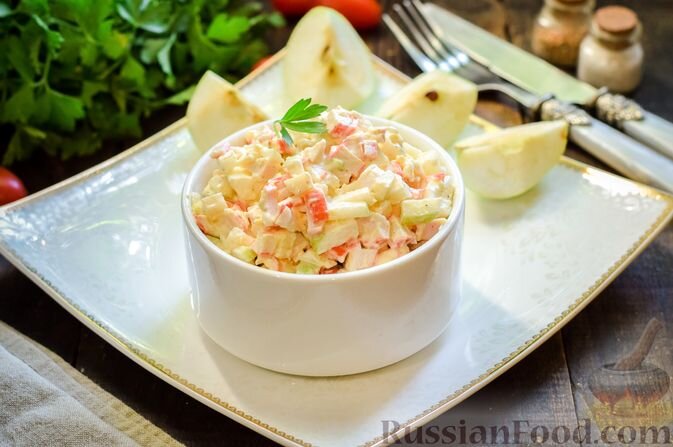 - Ингредиенты: крабовые палочки, яблоко, брынза, яйца, майонез, соль, черный перец.