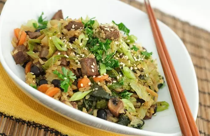 Этот яркий и питательный жареный рис станет отличным вариантом для быстрого ужина. Сочетание свежих овощей и ароматного соевого соуса придаст блюду неповторимый вкус. А подача с мисо-супом сделает его поистине полноценным!