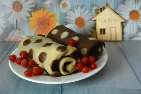 Для начала стоит приготовить блинное тесто, разделив его на две части. В одну из них добавьте немного какао, чтобы создать яркий контраст. На разогретую сковороду вылейте блинное тесто, а с помощью шприца или кондитерского мешка сделайте небольшие горошины из шоколадного теста.