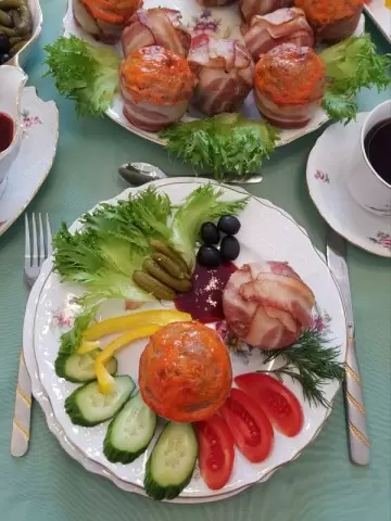 Для второго варианта котлет бекон ставится вертикально вдоль стенок формы, а на дно также укладывается кусочек. Осторожно добавляется фарш, чтобы не повредить стенки из бекона. После этого верх котлет смазывается смесью майонеза и кетчупа.