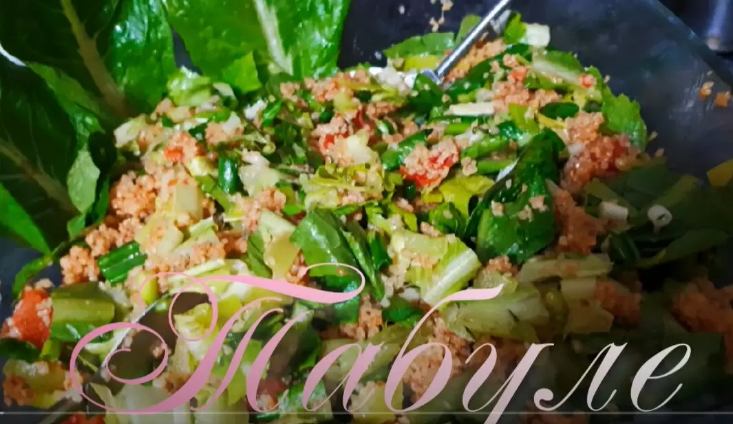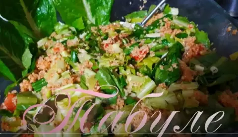 Начните с промывания и замачивания булгура в горячей воде с добавлением томатной пасты на 10-15 минут. За это время нарежьте зелень, зеленый лук и листья салата. Не забудьте добавить цедру и сок лимона, мелко нарезанный чеснок, а также подготовленные помидоры и сладкий перец.