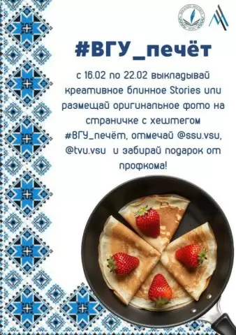 С 16 по 22 февраля в рамках празднования Масленичной недели пользователи социальной сети Instagram смогут принять участие в увлекательном челлендже под хештегом #ВГУ_Печёт. Этот проект организован Машеровцами и обещает стать настоящей кулинарной битвой!