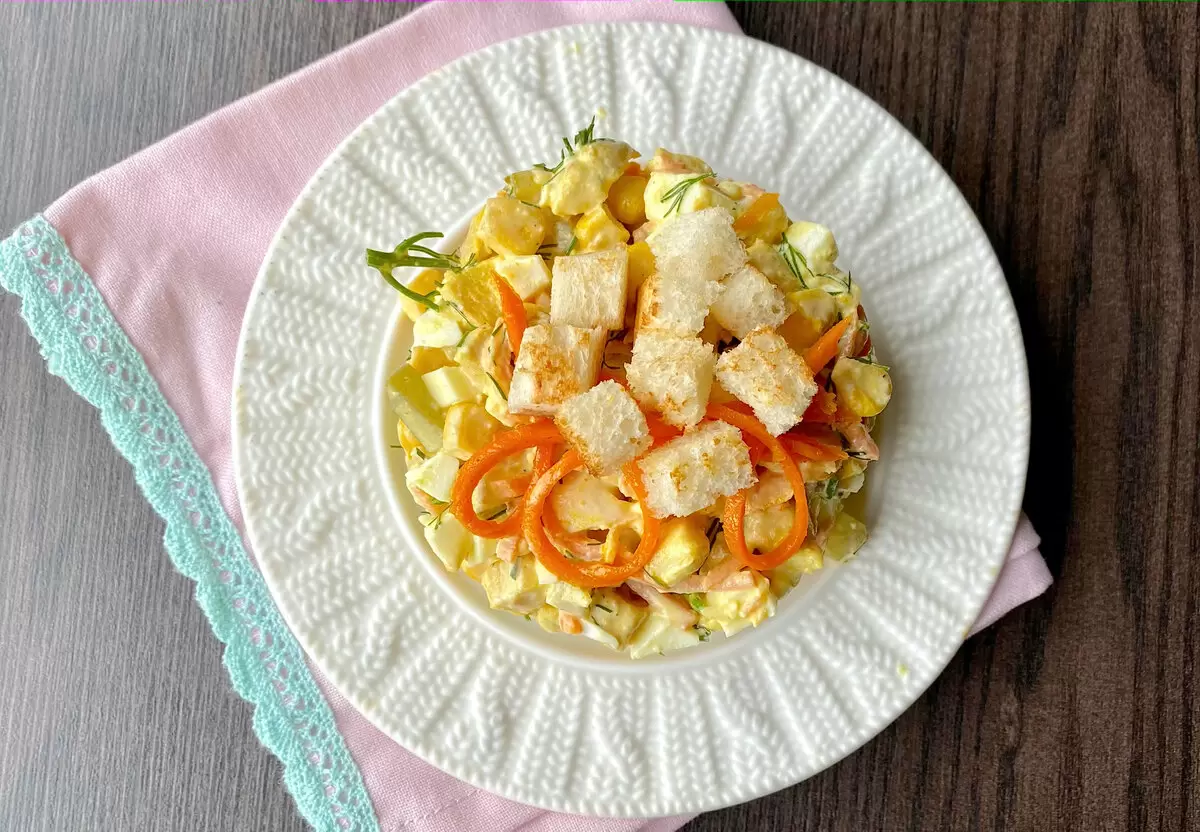 Далее, к замаринованным огурцам, нарезанным на маленькие кубики, добавляется морковь по-корейски и консервированная кукуруза. Для вкуса и аромата можно положить немного свежего укропа, который, впрочем, можно и не использовать по желанию. В завершение добавьте нарезанные вареные яйца и заправьте салат майонезом, тщательно перемешивая все ингредиенты.