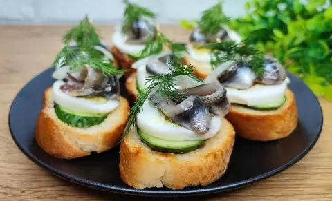Смажьте каждый кусочек багета майонезом. Затем разместите на нем огурец, яйцо и рыбку. Закрепите все зубочисткой или шпажкой и добавьте веточку укропа для украшения.