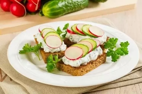 1. Тосты с творожным кремом, редисом и огурцом