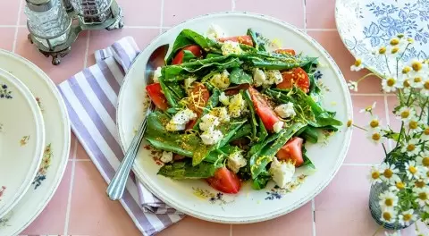 Десяток листьев щавеля в сочетании с мясистыми помидорами и нежным молодым сыром создаст неповторимый вкусовой симбиоз. Этот салат отличается своей легкостью и идеально подходит для весеннего стола, даря свежесть и яркие эмоции.
