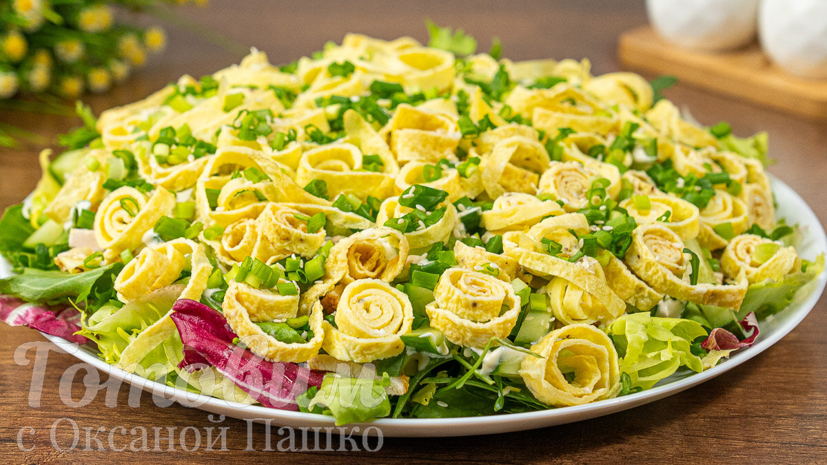 Представляем удивительный салат, который станет настоящим украшением вашего праздничного стола. Сочетая свежие ингредиенты, этот рецепт понравится любителям зелени, радуя разнообразием текстур и вкусов. Хрустящий салатный микс в сочетании с ароматными огурцами и нежной курочкой создаст неповторимое блюдо, а рулетики из яичных блинчиков добавят привлекательности и изысканности. Несмотря на наличие майонеза, наш салат остается легким и аппетитным, идеально подходящим для любого торжества.