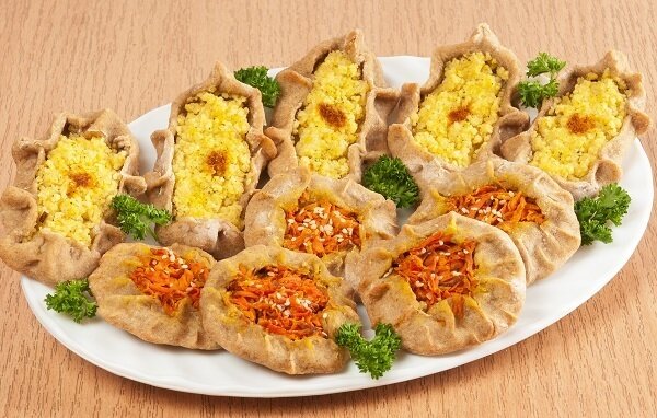 Раскатывать тесто в жгут и нарезать на равные кусочки. Каждую порцию раскатать в лепешку, выложить на одну половину начинку с морковью, на другую — с пшением, оставляя по 2 см от краев. Загнуть края и аккуратно защипнуть их. Калитки с морковной начинкой посыпать кунжутом.