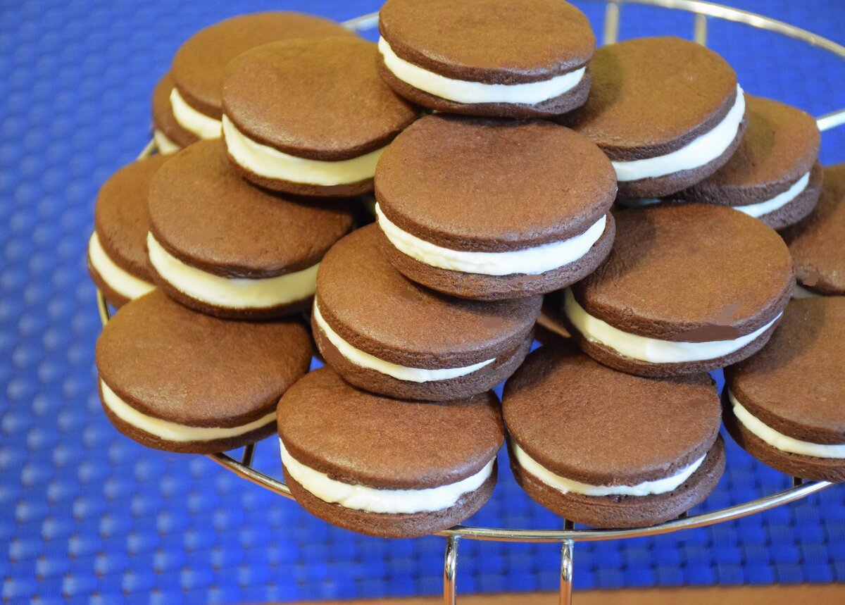 Поместить крем в кондитерский мешок и равномерно нанести его на одну половинку печенья, накрыть второй половинкой и слегка прижать.