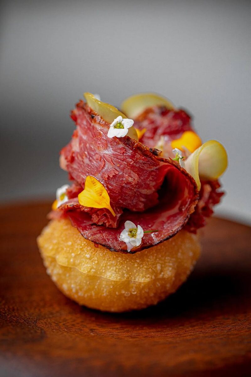Ресторан Twins Garden представляет новое кулинарное творение — пончик с пастрами и запечённым топинамбуром, который стал звездой дегустационного сета «Ферма». Этот хрустящий деликатес покоряет сердца гурманов своим идеальным сочетанием вкусов, пишет источник.