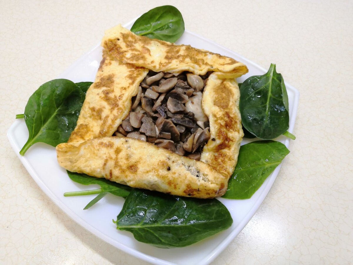 Финальная сборка: В центр омлета выкладывается грибная начинка с сыром. Края омлета загибаются к середине, оставляя центральную часть открытой. Блюдо подержать еще минуту на огне перед подачей.
