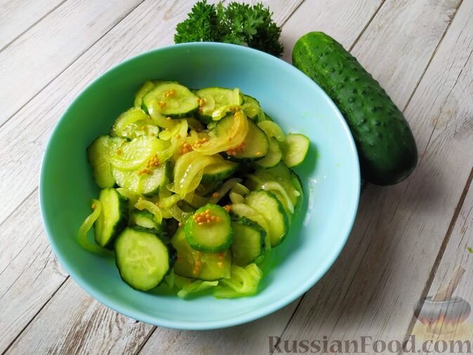 - Пикантные огурцы: всего несколько шагов — нарезанные огурцы с луком заливаются кипящим маринадом. Эта закуска будет прекрасным дополнением к любому горячему блюду.
