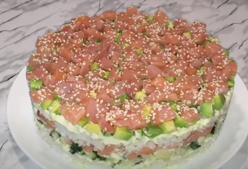 Заключительный шаг: ломтики авокадо перемешиваются с остатками огурцов и укладываются поверх риса, завершив композицию оставшимися ломтиками лосося. Салат посыпается кунжутом и отправляется в холодильник на 2-4 часа. Соевый соус подается отдельно.