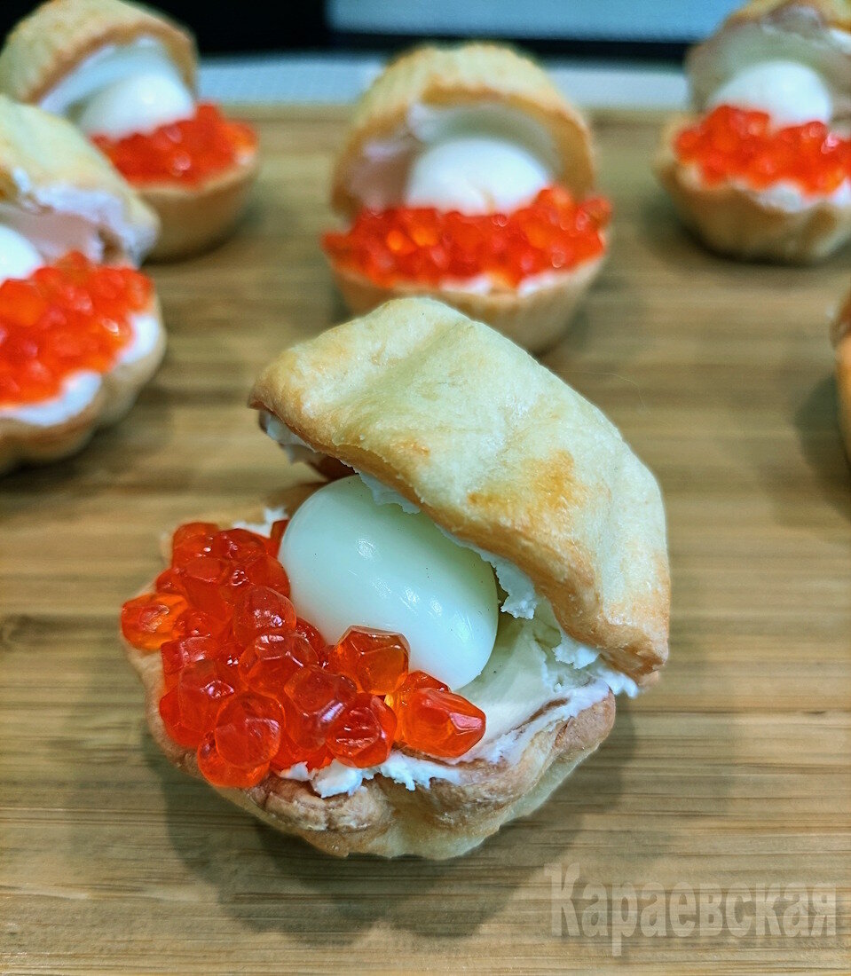 Каждая тарталетка наполняется кремом чизом. В 6 тарталеток кладут красную икру и по одному перепелиному яйцу, а затем соединяют парные тарталетки, одну с яйцом и икрой, и другую с кремом. В итоге получается эффектное и вкусное угощение!