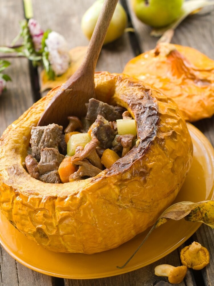 Подготовленную тыкву немного посолить, начинить мясной смесью, добавить те же щепотки соли и перца, затем полить сметаной. Закрываем крышкой и плотно оборачиваем в фольгу.