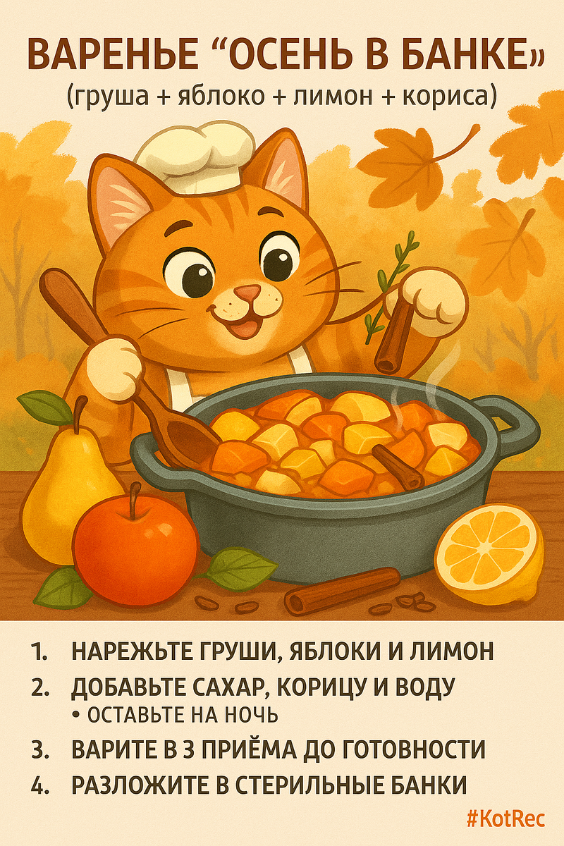 Это варенье — настоящее воплощение осени, в нём переплетаются золотистые кусочки фруктов, свежий аромат лимона и тёплая пряность корицы. Оно идеально подходит к утренним тостам, блинам или может стать чудесной начинкой для пирогов.