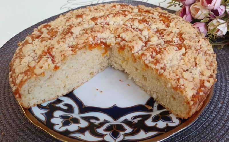 3. Смажьте форму диаметром 22 см растительным маслом. Вылейте тесто, равномерно распределите, сверху добавьте джем и посыпьте крошкой.