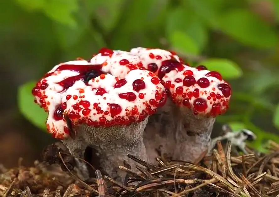 Гименофор: Самая поразительная часть гриба – это его иголки, расположенные на нижней стороне шляпки и достигающие длины до сантиметра. Они плотно размещены и имеют белый или кремовый цвет. В период активного роста на кончиках этих иголок выделяется красная вязкая жидкость, которая придаёт грибу его именование. Это явление, известное как капельно-красная эксудация, представляет собой не кровь, а сок гриба, содержащий пигменты.