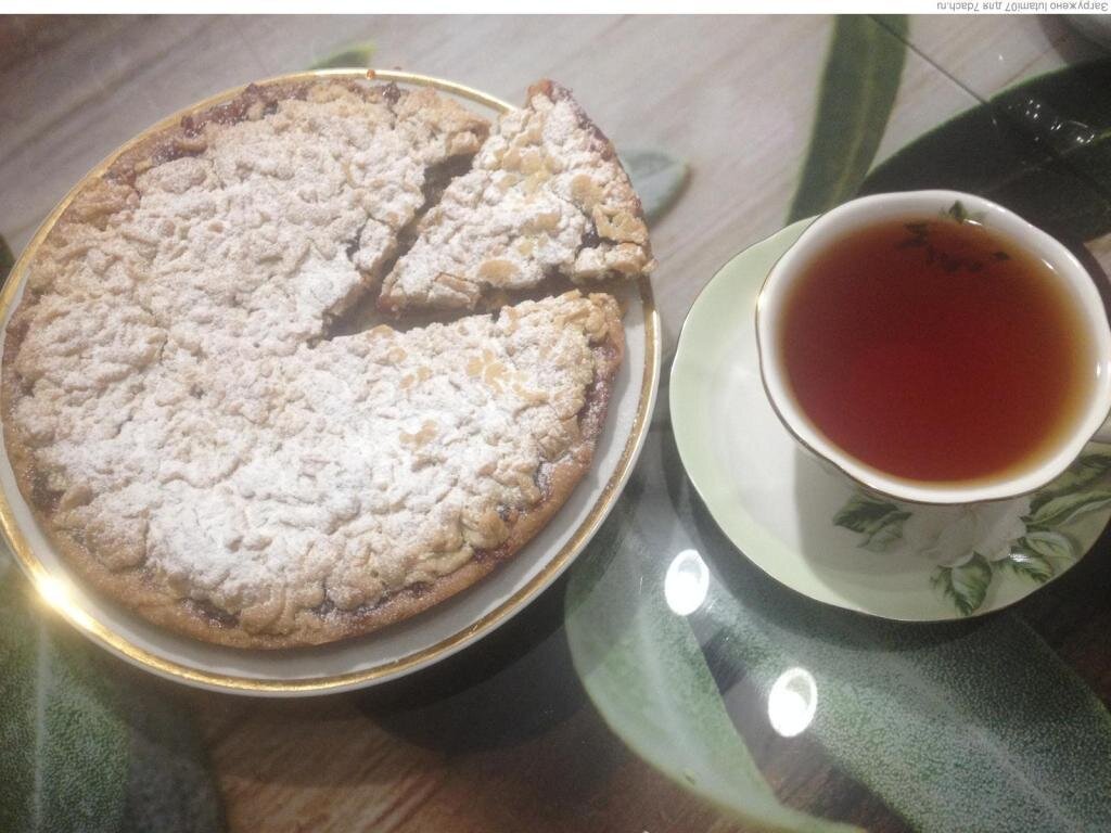 Как только тесто застыла, его нужно натереть на терке прямо в форму с тестом. Пирог заполняется вареньем — любое, по желанию. В данном случае подойдет брусника с яблоками.