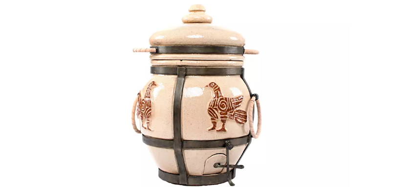На сайте интернет-магазина "Шелковый путь" можно выбрать и купить этот замечательный тандыр, воспользовавшись промокодом 507 для получения скидки в 5% на все товары. Изделие выполнено с учетом эстетики и практичности: кованый каркас предотвращает трещины и не требует подставки, а отделка из глянцевой глины с золотистыми узорами делает его настоящим арт-объектом.