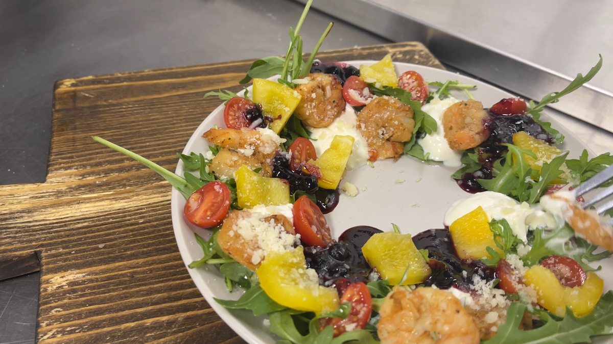 На круглой тарелке разложите листья салата: это могут быть айсберг, шпинат, романо или даже верхушки пекинской капусты. Затем аккуратно выкладывайте капельками сметану, поверх нее — курицу (или креветки/гребешки), нарезанные томаты черри и болгарский перец. В завершение добавьте соус из ягодного джема и перца.