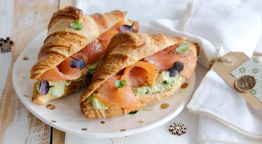 Приправьте ломтики лосося свежемолотым черным перцем. Разрежьте круассаны вдоль, не доходя до конца. Порежьте их пополам и обильно намажьте получившейся пастой из авокадо. Положите лосось, а по желанию добавьте листочки зелени. Подавайте к столу немедленно, наслаждаясь свежестью ингредиентов!