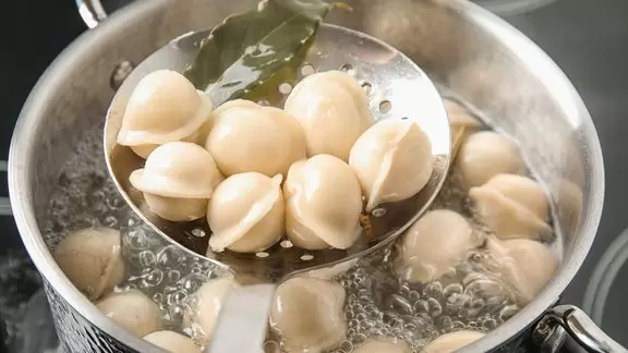 Чтобы этого избежать, стоит добавить полстакана холодной воды через три минуты после закипания. Это создает стабильно комфортную температуру, что в итоге гарантирует равномерное приготовление каждого пельменя.