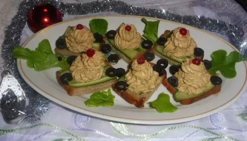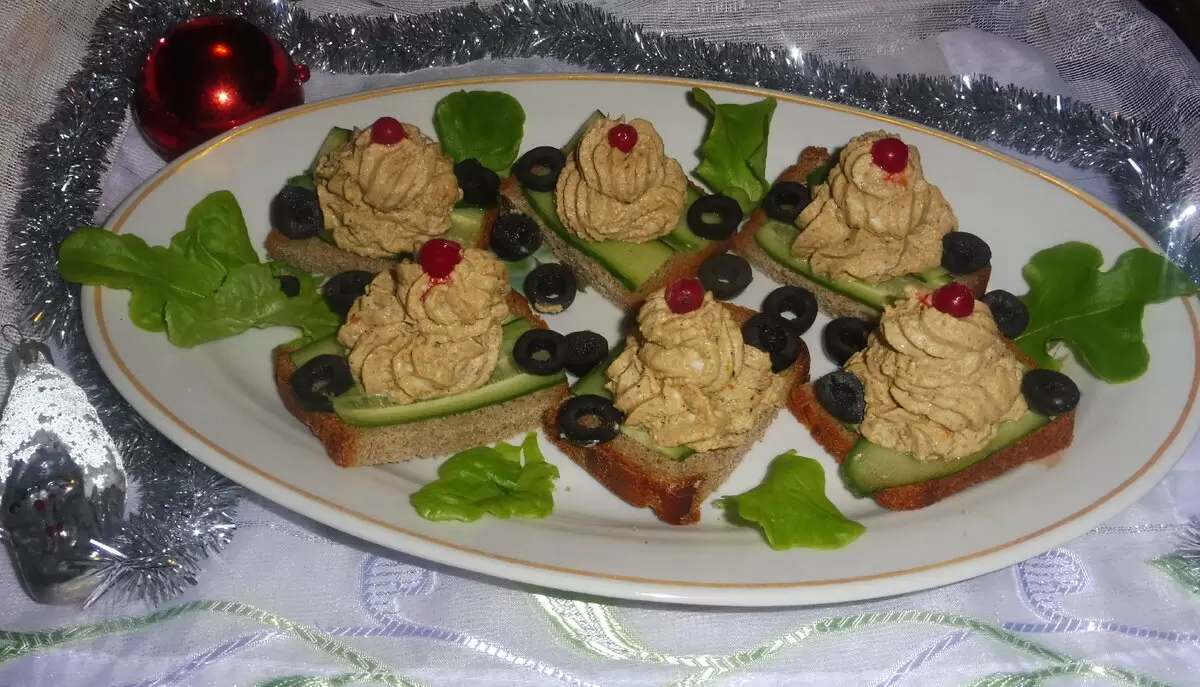 В завершение можно украсить блюдо ягодами красной смородины и дольками оливок, придавая закуске изысканный вид.