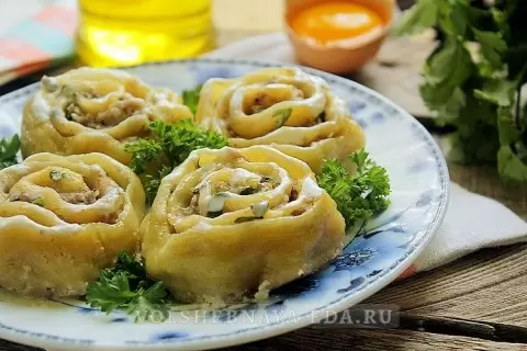 Подготовленные «розочки» обжарить на сковороде с кусочками сливочного масла, чтобы они не слиплись друг с другом. В процессе жарки используется сметана, разбавленная водой, для создания нежного соуса. После того как пельмени подрумянятся с одной стороны, их нужно накрыть крышкой и оставить томиться на среднем огне еще на 15 минут. По истечении времени получаются аппетитные и ароматные ленивые пельмени в соусе. Подаются они, как правило, украшенные свежей зеленью.