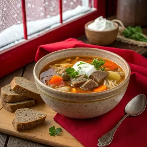 Щи, наполненные вкусом и ароматом, варятся на говяжьем бульоне с добавлением картофеля и тушенных овощей. За 30 минут можно насладиться горячим и сытным блюдом, которое прекрасно подойдет для любого семейного ужина.