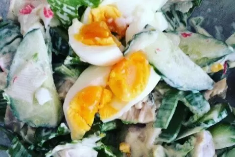 Для начала, яйца нужно отварить (рекомендуется взять 2 шт.) и нарезать крупными дольками.Кальмаров и крабов (в консервированном или замороженном виде) следует нарезать вдоль, образуя длинные ломтики. Если используется замороженный продукт, предварительно рекомендуется отварить в подсоленной воде.Свежий огурец разрезают пополам и нарезают крупными частями, добавляя в салат.Авокадо очищаем, сбрызгиваем лимонным соком и нарезаем аналогично огурцу, затем отправляем в салат.Приправляем все майонезом и подаем в прозрачных вазочках для лучшего визуального эффекта.Приятного аппетита! Не забывайте, что ссылка на больше рецептов доступна на сайте eda.ru!