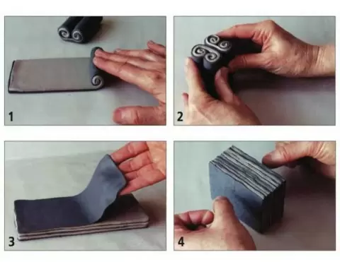Термин нэрикоми возникает от слова, обозначающего «замешивание». Эта техника подразумевает смешение нескольких цветов глины, которые затем нарезаются и укладываются друг на друга, формируя многослойный блок. Например, блок из серой и голубой глины нарезают на тонкие пласты, которые затем вдавливаются в форму.