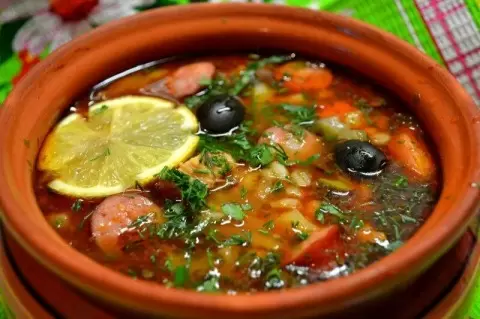 Наконец, разложив солянку по тарелкам, не забудьте украсить ее дольками лимона и маслинами.