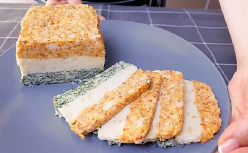Затем сформируйте слои в подготовленной контейнере, чередуя смеси и плотно прижимая их. Закройте плёнкой и поставьте в холодильник минимум на 5 часов, чтобы все ароматы хорошо перемешались. После этого вы получите красивую, ароматную и очень вкусную закуску, которая удивит всех гостей.