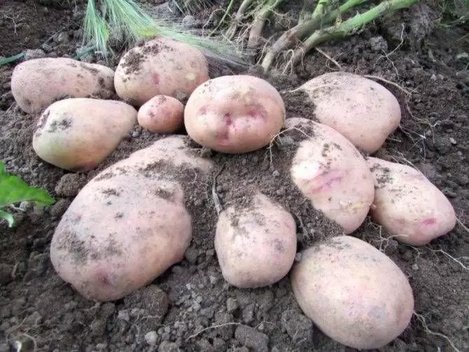 - Розара: В одном гнезде может находиться до 20 клубней. Розово-красные клубни с желтой мякотью почти не темнеют и подходят для жарки благодаря слабой развариваемости. Устойчив к фитофторозу и обыкновенной парше.