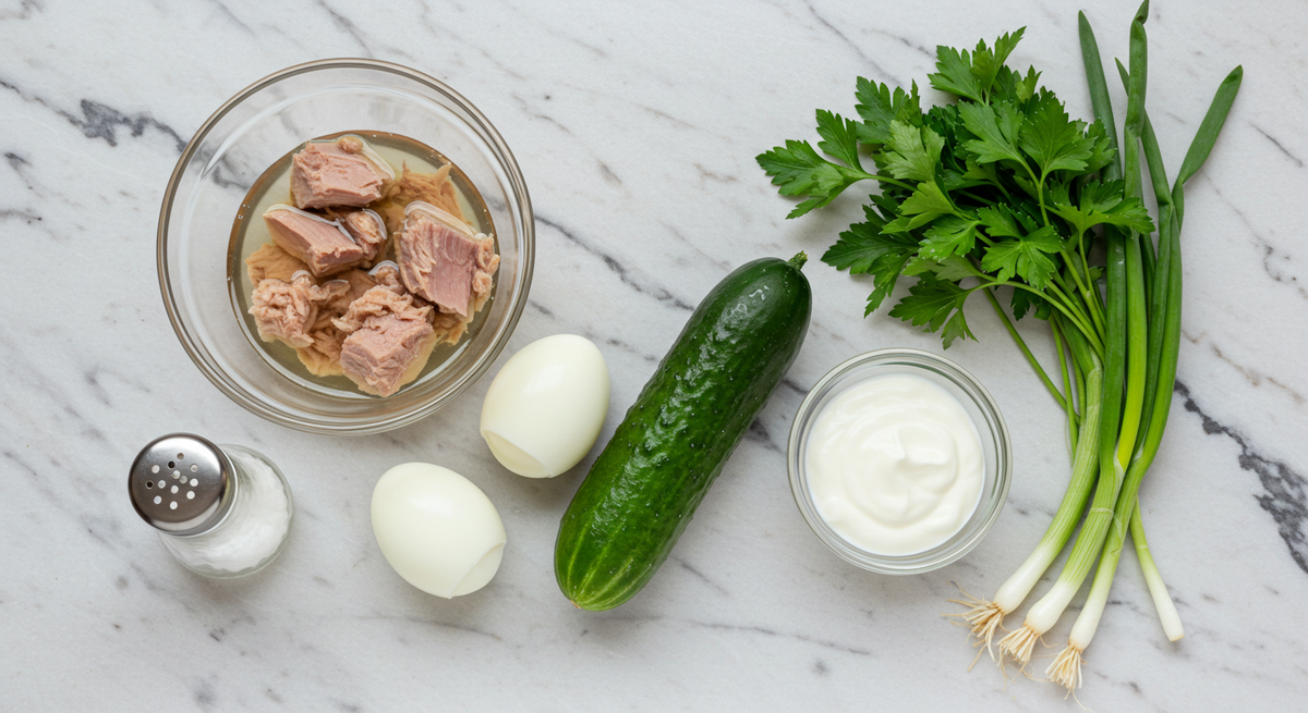 Сборка салата. В глубокой салатнице аккуратно смешайте все компоненты: тунец, нарезанные яйца, огурец и зелень. Заправьте густым йогуртом и тщательно перемешайте перед подачей. Щепотка соли поможет раскрыть все ароматы, не теряя свежести ощущений.