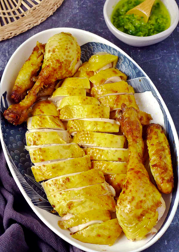 Далее следует разогреть духовку до 200°C и поместить курицу в жаропрочную форму. Внутрь стоит добавить нарезанный зеленый лук и имбирь. Покрыть крышкой или фольгой и запекать в течение 1 часа. После запекания курицу необходимо оставить на 30 минут в закрытой посуде, чтобы она «отдохнула» и сохранила свою сочность.