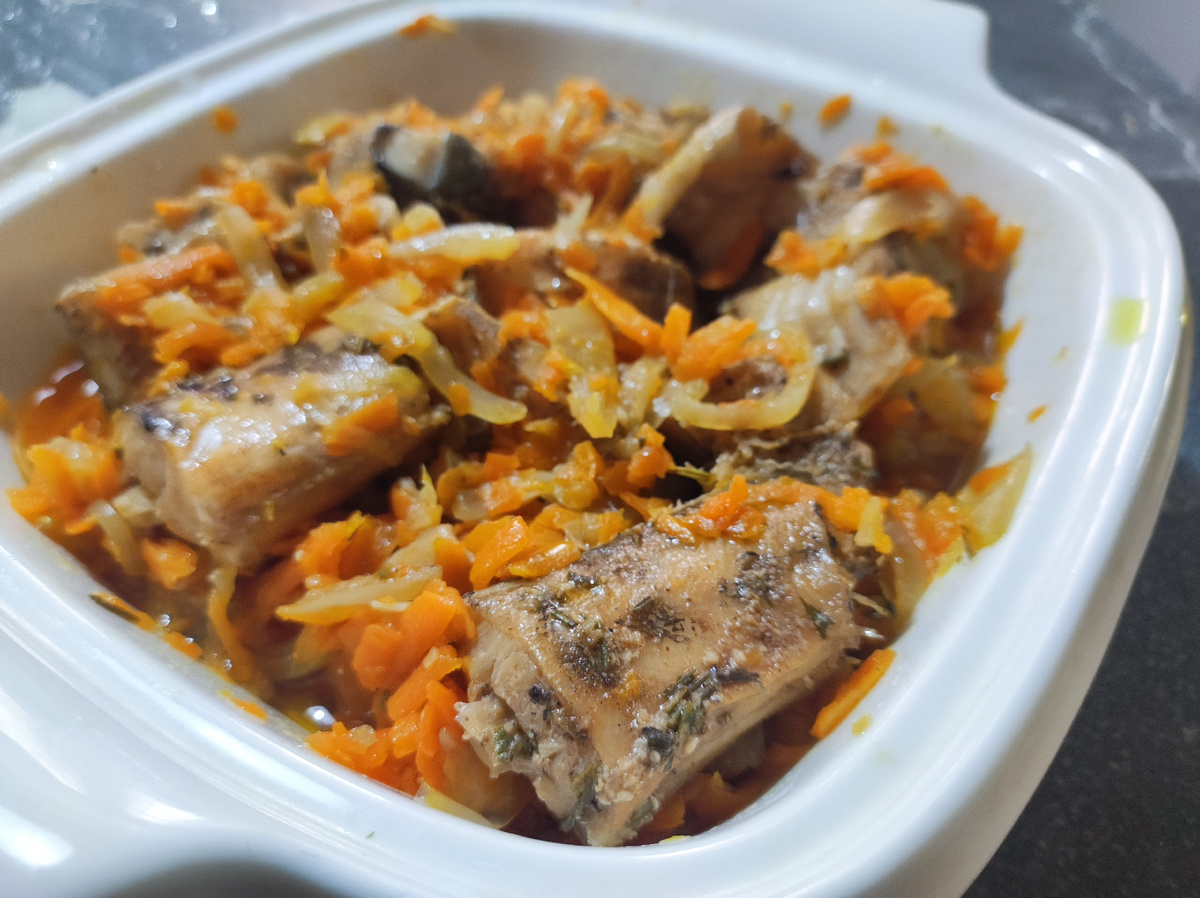 Рыбу нарезали на кусочки и замариновали с соевым соусом и различными специями. Важным фактором стали овощи: две большие моркови и лук были обжарены и протушены отдельно, чтобы привлечь внимание к их вкусу как отдельного блюда.